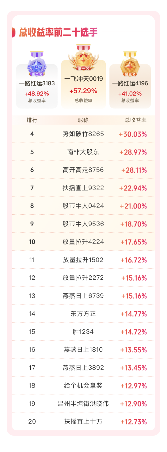 收益率总榜Top1【一飞冲天0019】,总收益率达57.29%