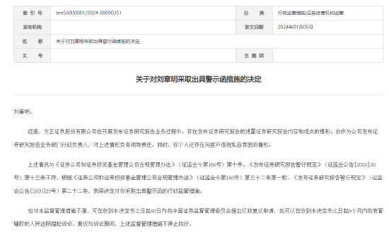 2024年1月5日,方正证券刘章明因发布证券研究报告前泄露证券研究报告内容和观点以及私自荐股被证监会出具警示函。