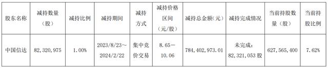 中国信达减持结果本次减持计划实施前,中国信达持有方正证券股份数量为709,886,375股,占公司总股本的8.62%,股份来源为协议转让获得。