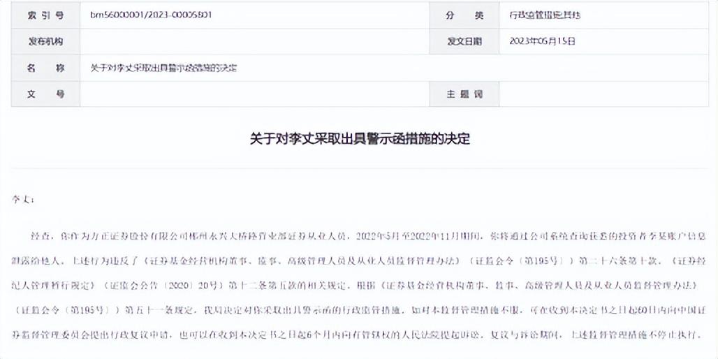 2023年6月15日,湖南证监局出具了一则警示函,李丈作为方正证券郴州永兴大桥路营业部证券从业人员,在2022年5月至2022年11月任职长达半年的时间里,存在将通过公司系统查询获悉的投资者李某账户信息泄露给他人的违法违规行为,被湖南证监局采取监管警示措施。