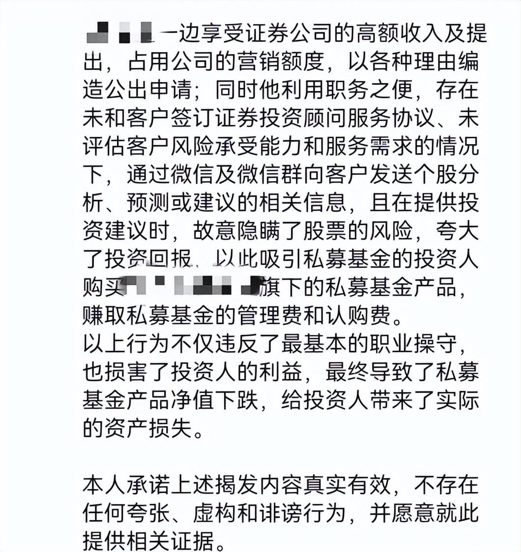 具体来看,举报内容包括员工一边享受证券公司的高额收入及提出,占用公司的营销额度,以各种理由编造公出申请,同时利用职务之便,存在未和客户签订证券投资顾问服务协议、未评估客户风险承受能力和服务需求的情况下,通过微信及微信群向客户发送个股分预测或建议的相关信息,且在提供投资建议时,故意隐瞒了股票的风险,夸大投资回报,以此吸引投资人购买私募基金产品。
