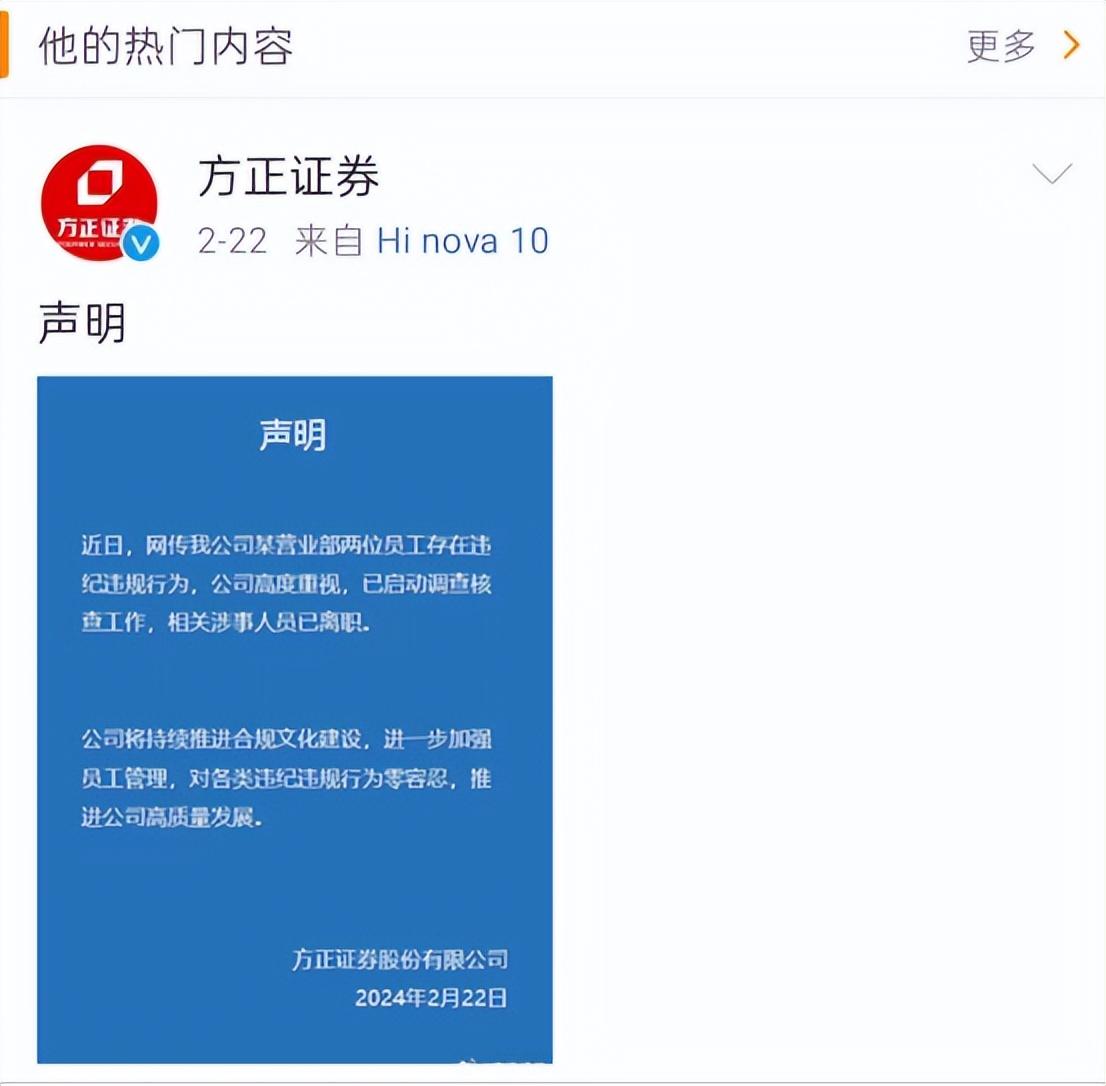 事情被曝光发酵后,方正证券也很快做出了回应,仅仅相隔一天,2月22日,方正证券官方发布声明回应称:近日,网传我公司某营业部两位员工存在违纪违规行为,公司高度重视,已启动调查核查工作,相关涉事人员已离职。
