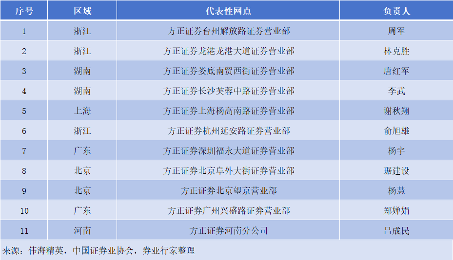 综合网点数量、创收规模和创利水平的公开信息,以及渠道价值量统计的独家数据,行家列示了方正证券部分有代表性的网点及负责人。