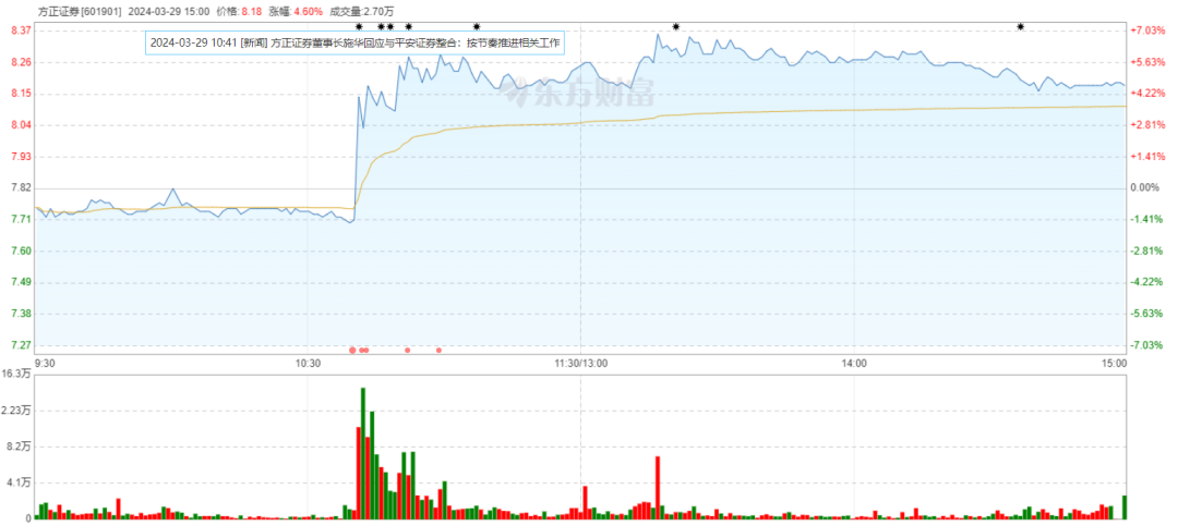 今日盘中,方正证券跳空低开;但在上午10点41分,出现了直线拉涨,短期内最高涨幅接近7%。这一异动,对应着一则资讯——方正证券董事长在业绩说明会上回应了与平安证券整合的进展情况:“有序推进相关工作”。截至收盘,方正证券上涨4.60%,总市值达673.39亿。