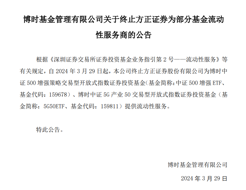 就在今天(2024年3月29日),头部公募博时基金管理有限公司(简称:博时基金)做出了重要的决定:公告宣布,即日起终止方正证券为博时中证500增强策略交易型开放式指数证券投资基金(基金简称:中证500增强ETF,基金代码:159678)和博时中证5G产业50交易型开放式指数证券投资基金(基金简称:5G50ETF,基金代码:159811)提供流动性服务。