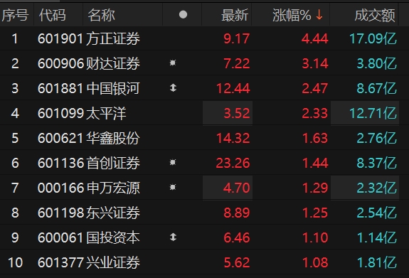 5月10日,证券板块午后震荡走高,截至13时30分,方正证券涨超4%,财达证券涨超3%,中国银河、首创证券等跟涨。