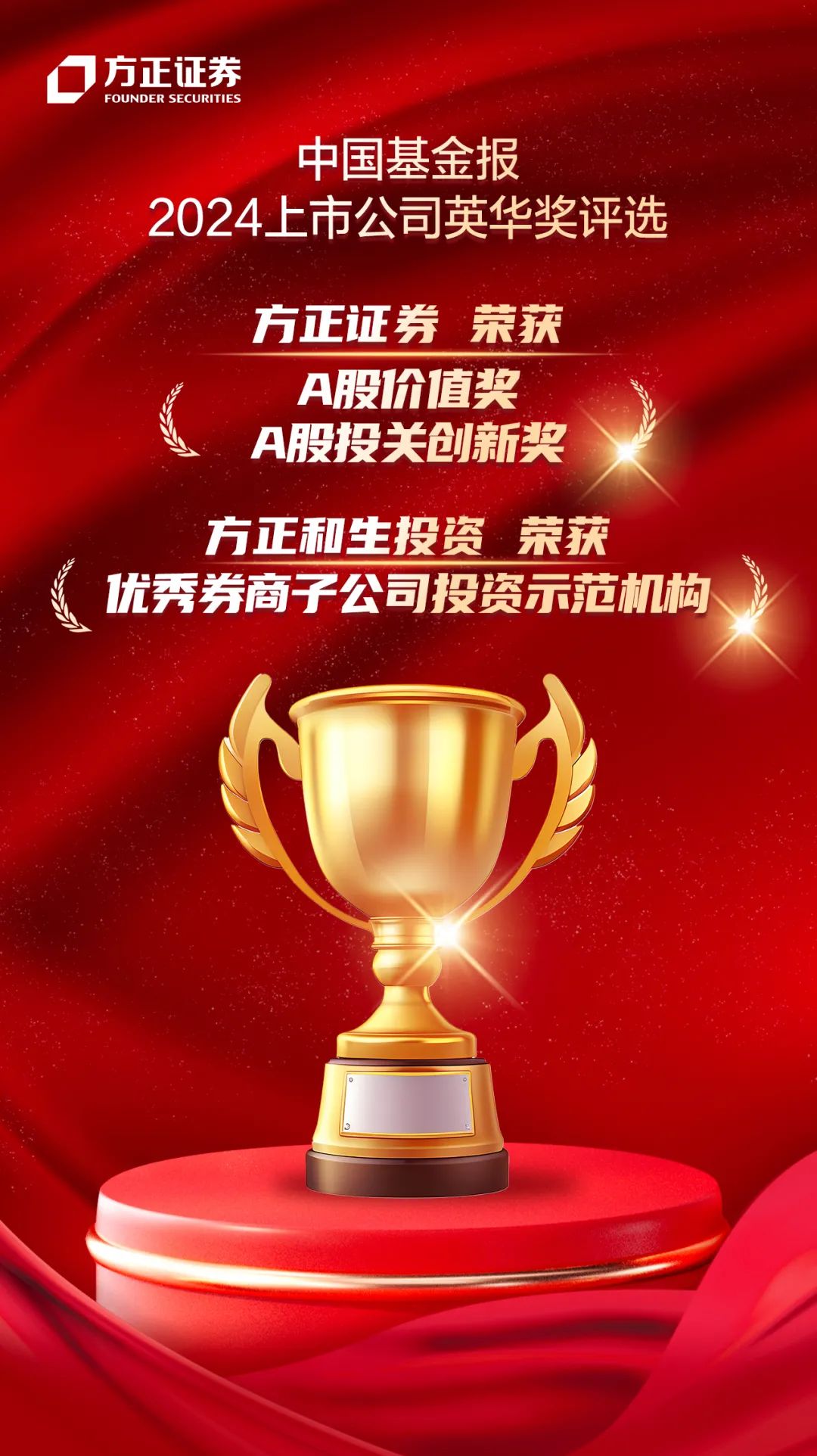 论坛上公布了2024年“英华奖”评选结果,在优秀上市公司“英华奖”评选中,方正证券荣获“A股价值奖”和“A股投关创新奖”;在股权创投私募“英华奖”评选中,方正证券私募股权管理子公司方正和生投资荣获“优秀券商子公司投资示范机构”。