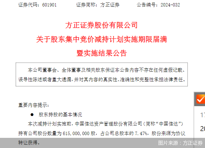 12月9日,方正证券发布公告表示,公司此前在8月17日披露了《关于股东集中竞价减持股份计划的公告》,股东中国信达资产管理股份有限公司(以下简称“中国信达”)拟于9月9日至12月8日期间,以集中竞价交易方式减持公司股份不超过8232.1万股(约占公司总股本的1%)。