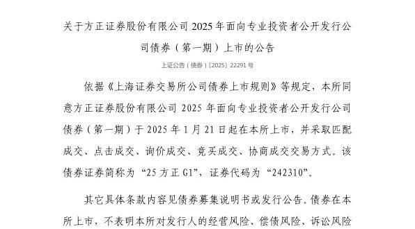 1月20日,上交所发布关于方正证券股份有限公司2025年面向专业投资者公开发行公司债券(第一期)上市的公告。