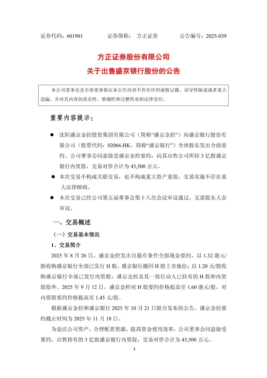近日,方正证券股份有限公司(以下简称“方正证券”)发布了《关于出售盛京银行股份的公告》。公告显示,沈阳盛京金控投资集团有限公司(以下简称“盛京金控”)向盛京银行全体股东发出全面要约。方正证券董事会同意接受盛京金控要约,向其出售公司所持3亿股盛京银行内资股,交易对价合计为4.35亿元。