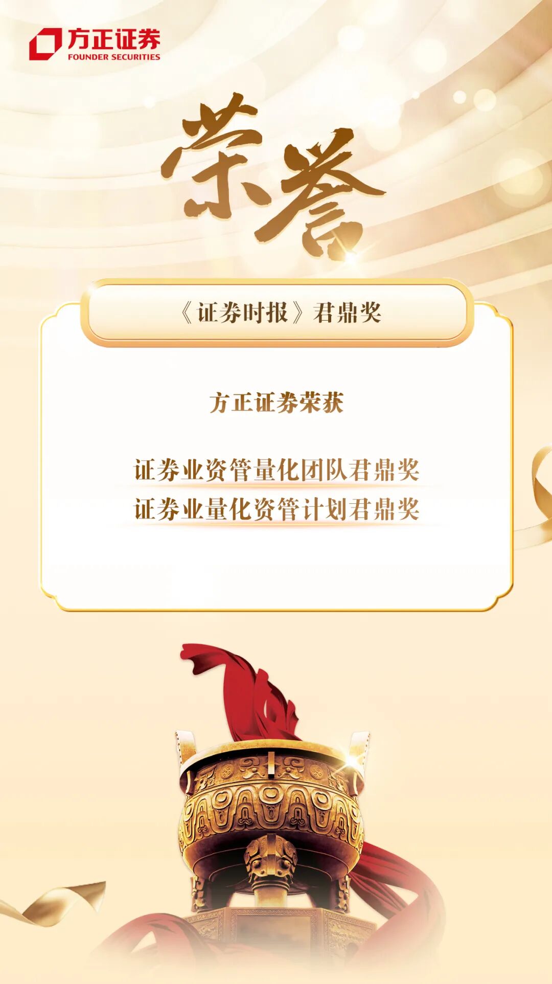 11月19日,在《证券时报》主办的“第十九届深圳国际金融博览会暨2025中国金融机构年会”上, 方正证券 获得《证券时报》“君鼎奖”资产管理类奖项: