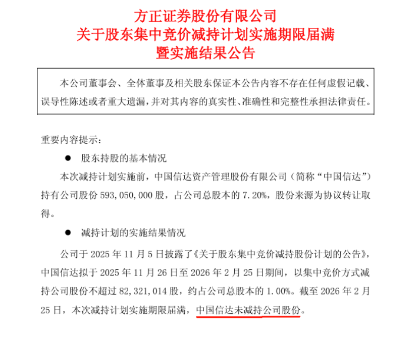 然而,2026年2月25日减持期限届满后,方正证券披露的结果显示:中国信达在此期间未减持任何股份。
