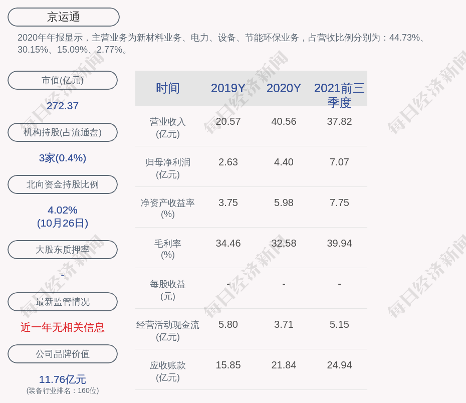 2020年年报显示,京运通的主营业务为新材料业务、电力、设备、节能环保业务,占营收比例分别为:44.73%、30.15%、15.09%、2.77%。