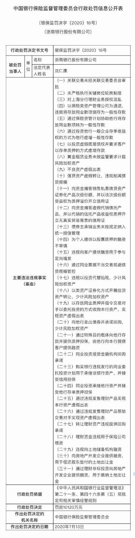 在2020年9月,浙商银行因理财业务授权混乱、不良资产虚假出表、违规将存放同业款项倒存为一般性存款等31项违法违规行为,被银保监会罚款1.01亿元。