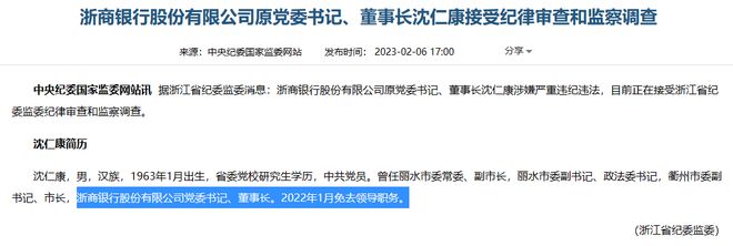 2月6日下午5点,据中央纪委监委通报,浙商银行原党委书记、董事长沈仁康涉嫌严重违纪违法,目前正在接受浙江省纪委监委纪律审查和监察调查。