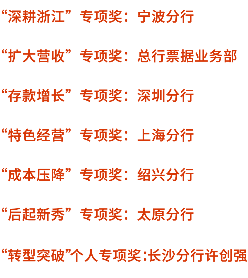 这一年,全行涌现出一大批优秀的机构、团队和个人,成为全面开启高质量发展新征程的“排头兵”。他们在重点战略任务推进中主动出击、积极作为,发挥重大作用,做出特别贡献;他们在深耕浙江、扩大营收、存款增长、特色经营、成本压降等专项领域中指标完成领先,在推进年度重点工作的“大考”中交出了高分答卷。