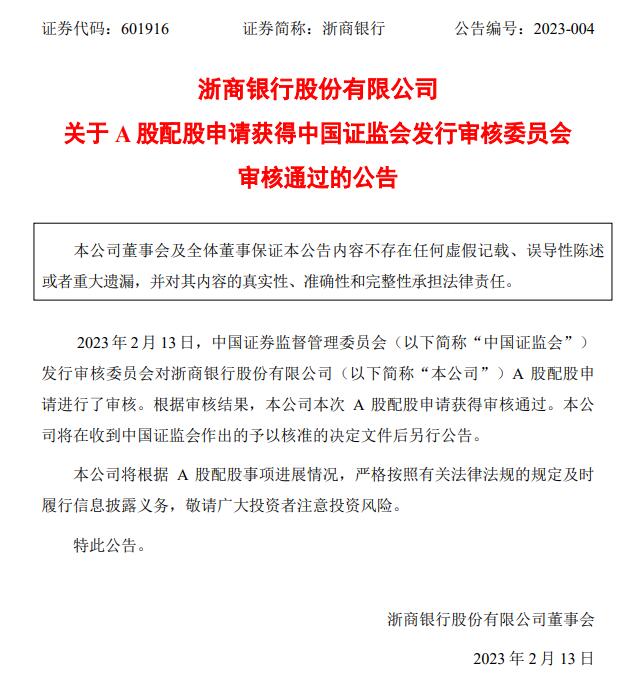 浙商银行(601916.SH)发布公告称,2月13日,中国证监会发行审核委员会对浙商银行A股配股申请进行了审核。根据审核结果,浙商银行本次A股配股申请获得审核通过。