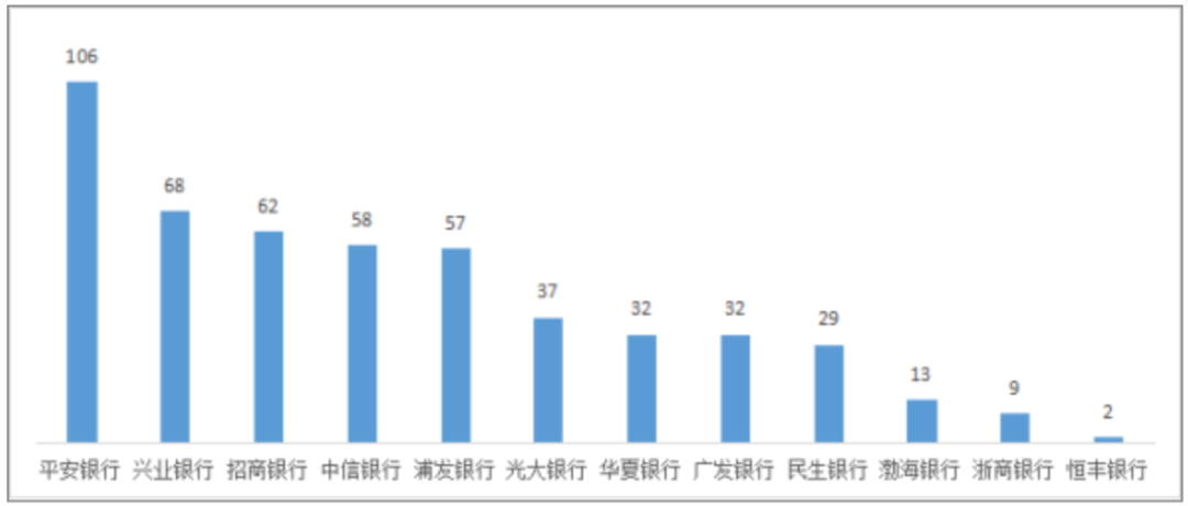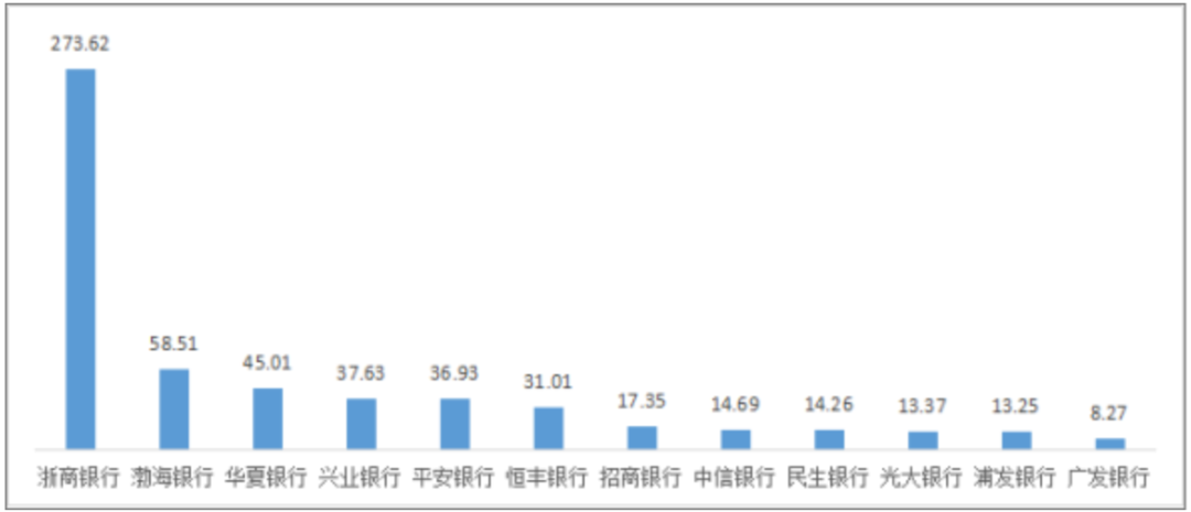 其中,浙商银行273.62件/百万个人客户,渤海银行58.51件/百万个人客户,华夏银行45.01件/百万个人客户,兴业银行37.63件/百万个人客户,平安银行36.93件/百万个人客户,恒丰银行31.01件/百万个人客户,招商银行17.35件/百万个人客户,中信银行14.69件/百万个人客户,民生银行14.26件/百万个人客户,光大银行13.37件/百万个人客户,浦发银行13.25件/百万个人客户,广发银行8.27件/百万个人客户。