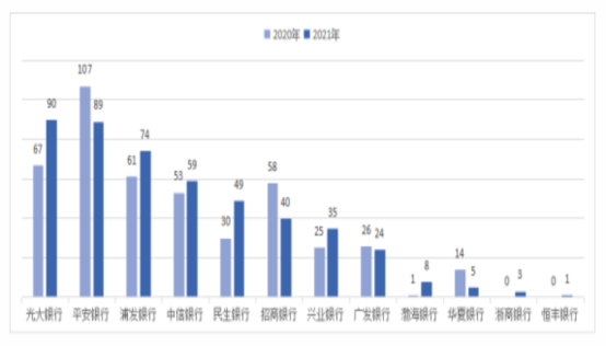 对比2021年的投诉量,2022年平安银行的投诉量量仍位居股份制银行的首位;2021年投诉量(90件)位居第二位的光大银行,2022年投诉量(37件)明显下降,位列股份制银行第六位;2021年投诉量(74件)位居第三位的浦发银行,2022年投诉量(57件)也明显下降,位列股份制银行第五位;
