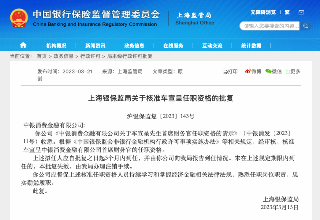 3月21日,上海银保监局发布的任职资格批复显示,经审核,核准车宣呈中银消费金融有限公司(简称“中银消费金融”)首席财务官的任职资格。