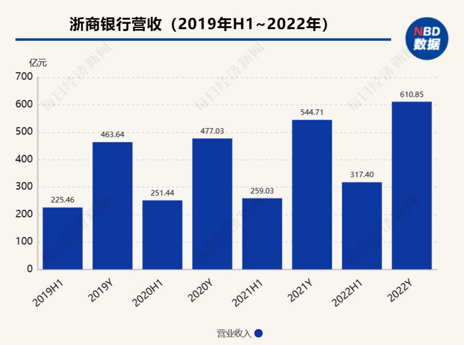 从收入结构来看,2022年浙商银行实现营业收入610.85亿元,其中利息净收入、非利息净收入分别为470.62亿元、140.23亿元,同比增幅均超12%。