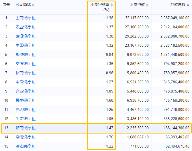 截至3月31日,易简财经小编梳理已出的银行年报时发现,在存款总额规模前十五的银行中,浙商银行的不良贷款率排到第三。