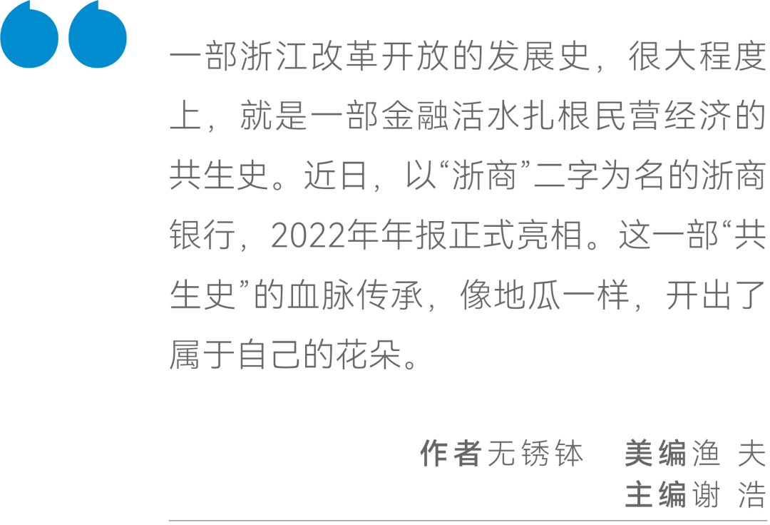 这个精妙的比喻背后,一部浙江改革开放的发展史,很大程度上,就是一部浙商敢为人先、勇立潮头、开枝散叶的创业史,和一部金融活水扎根民营经济的共生史。近日,以“浙商”二字为名的浙商银行,2022年年报正式亮相。这一部“共生史”的血脉传承,像地瓜一样,开出了属于自己的花朵。