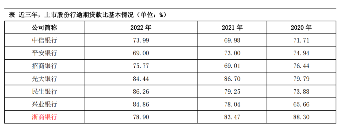 通过对比近三年逾期贷款比指标数值,浙商银行的逾贷比由2020年的88.30%下降至2022年的78.90%,侧面印证该行的五级分类审慎严格。2019年,银保监会发布了《商业银行金融资产风险分类暂行办法》公开征求意见,遵循2017年国际上巴塞尔委员会发布的不良资产和重组资产的统一标准,正式明确将逾期90天以上的贷款纳入不良。自此,银保监会从严执行逾期贷款指标,该指标成为判断一家银行不良认定标准审慎程度的重要尺度。截至目前,公开披露年报的银行90%以上都已达标,也有部分银行执行60天以上逾期贷款纳入不良的更严格标准。