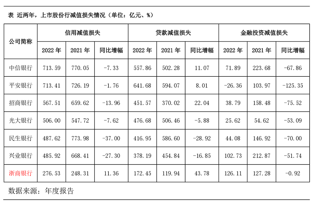 对比各家上市股份行的减值损失情况,去年整体行业呈现增幅下降趋势,股份行资产质量进一步优化。这里,浙商银行信用减值损失规模位列最后,整体风险规模较为可控,同比增速有所提升。