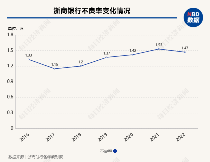 资产质量方面,2022年末,浙商银行不良贷款率1.47%,较年初下降0.06个百分点,也是近5年来首次实现下降;拨备覆盖率182.19%,比上年末上升7.58个百分点。
