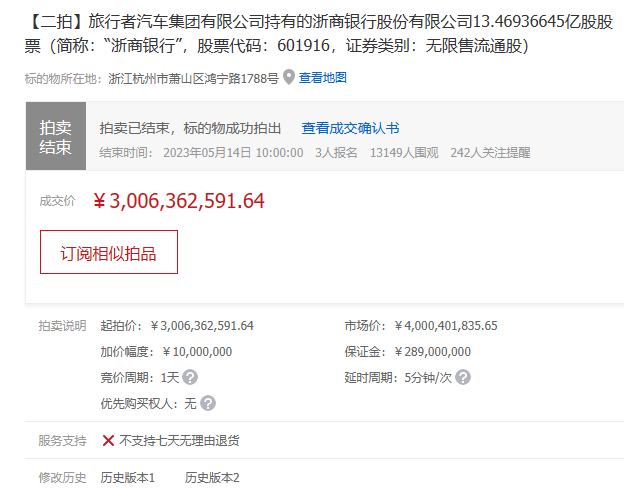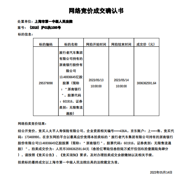 5月14日,浙商银行(SH601916,股价3.28元,市值697.6亿元)原股东旅行者汽车集团有限公司(简称“旅行者汽车集团”)持有的13.469亿股股份(占总股本的6.33%)由太平人寿保险股份有限公司(简称“太平寿险”)竞得,成交价30.06亿元。