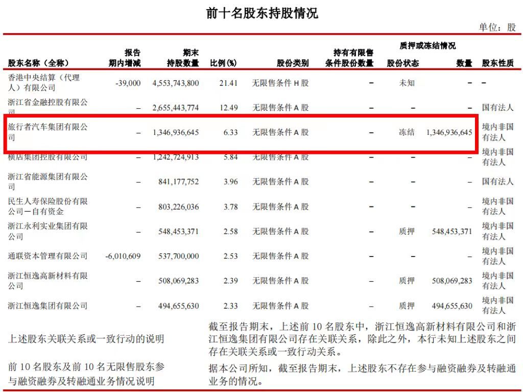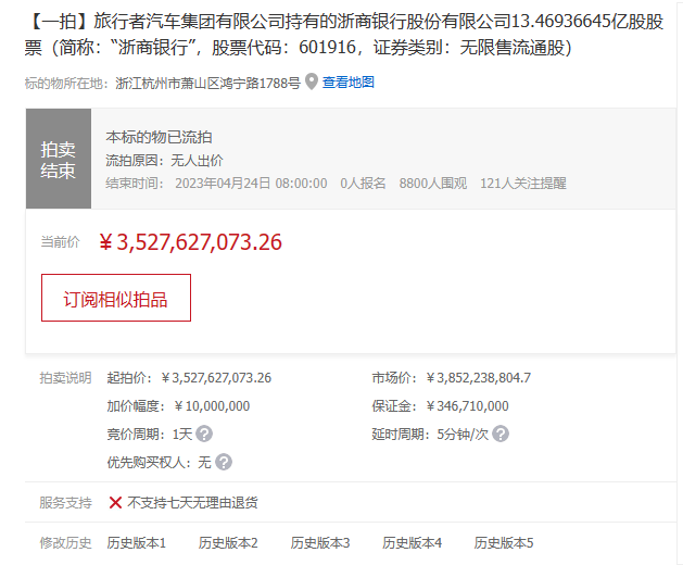 随后,浙商银行公告称,旅行者汽车集团本次股份变动系司法拍卖导致的被动减持。本次司法拍卖网拍阶段已经结束,拍卖标的最终成交以上海市第一中级人民法院出具的裁定为准,该行将根据裁定结果及时披露最终竞买人信息和股份裁定过户情况。