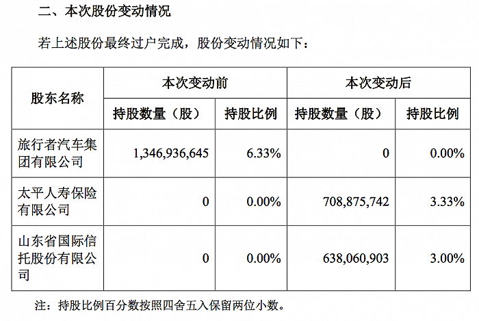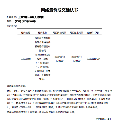 公告称,浙商银行已知悉上海市第一中级人民法院已出具相关《执行裁定书》,并已于当日送达相关买受人。根据该裁定书,太平人寿和山东国信成功竞得原股东旅行者汽车集团旗下持有的13.47亿股股份。