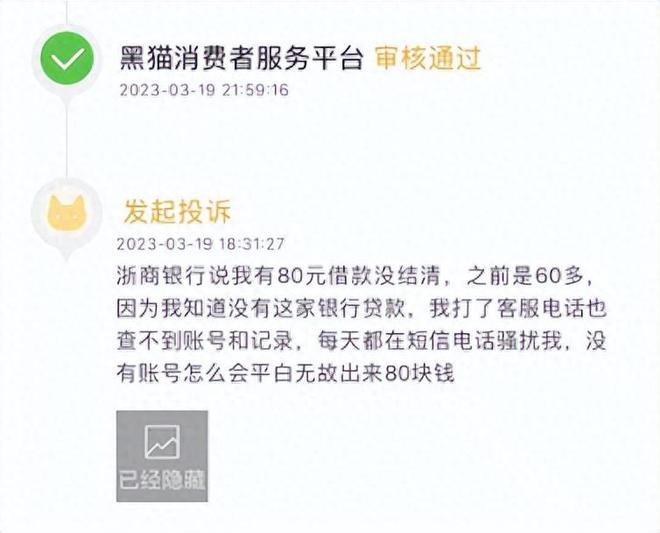 无独有偶,2023年3月,也有一位用户留言称被浙商银行告知有80元借款没有结清,之前是60多。自己联系了浙商银行客服,但并没有查到相关账号和记录,每天却要遭受短信骚扰。不理解为何没有账号,却会平白无故多出80元钱。