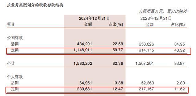 财报显示,截至2024年末,浙商银行来自公司和个人的定期存款余额合计为13885.92亿元,同比增长22.74%,增速较2023年的15.33%加快近7.5个百分点;占比72.24%,较2023年末的60.54%提升近12个百分点。