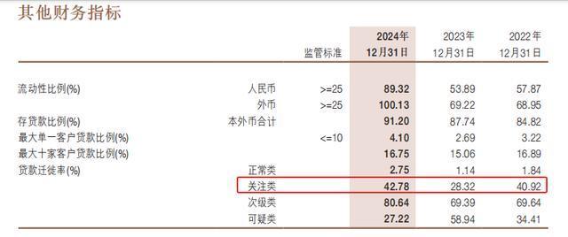 同时,截至2024年末,浙商银行的关注贷款达到444.88亿元,比2023年末增加94.05亿元;关注贷款率2.40%,比2023年末上升0.35个百分点;关注贷款迁徙率42.78%,较2023年末的28.32%大幅上扬14.46个百分点。