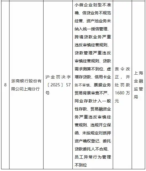 值得一提的是,今年1月,因多项违规,浙商银行上海分行被责令改正,罚款1680万元。