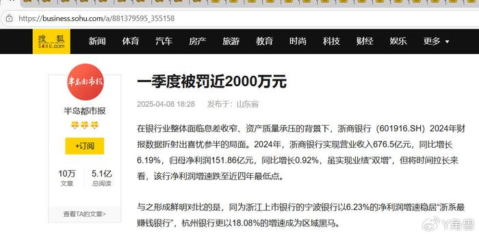 而同期,安永同步发布《中国42家A股上市银行2025年一季度业绩概览》概览显示42家A股上市银行2025年一季度净利润同比减少1.09%,营业收入同比减少1.72%。客观来看,相较于同行,陆建强领导下的浙商银行经营业绩位于行业中游,且呈持续上升趋势。然而,另一方面,浙商银行今年收到的罚单数量却大幅增加。