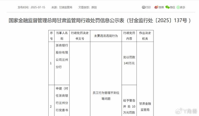 比如,7月15日,国家金融监督管理总局甘肃监管局公布了行政处罚信息公示表(甘金监行处〔2025〕137号),浙商银行股份有限公司兰州分行因员工行为管理不到位等问题,被处以罚款140万元。同时,申健(时任浙商银行兰州分行党委书记、行长)因员工行为管理不到位等问题,被给予警告并处10万元罚款;俞昱(时任浙商银行兰州分行风险监控官、行长助理)因员工行为管理不到位等问题,被给予警告并处5万元罚款;弓永平(时任浙商银行兰州分行党委委员)因员工行为管理不到位等问题,被禁止终身从事银行业工作。