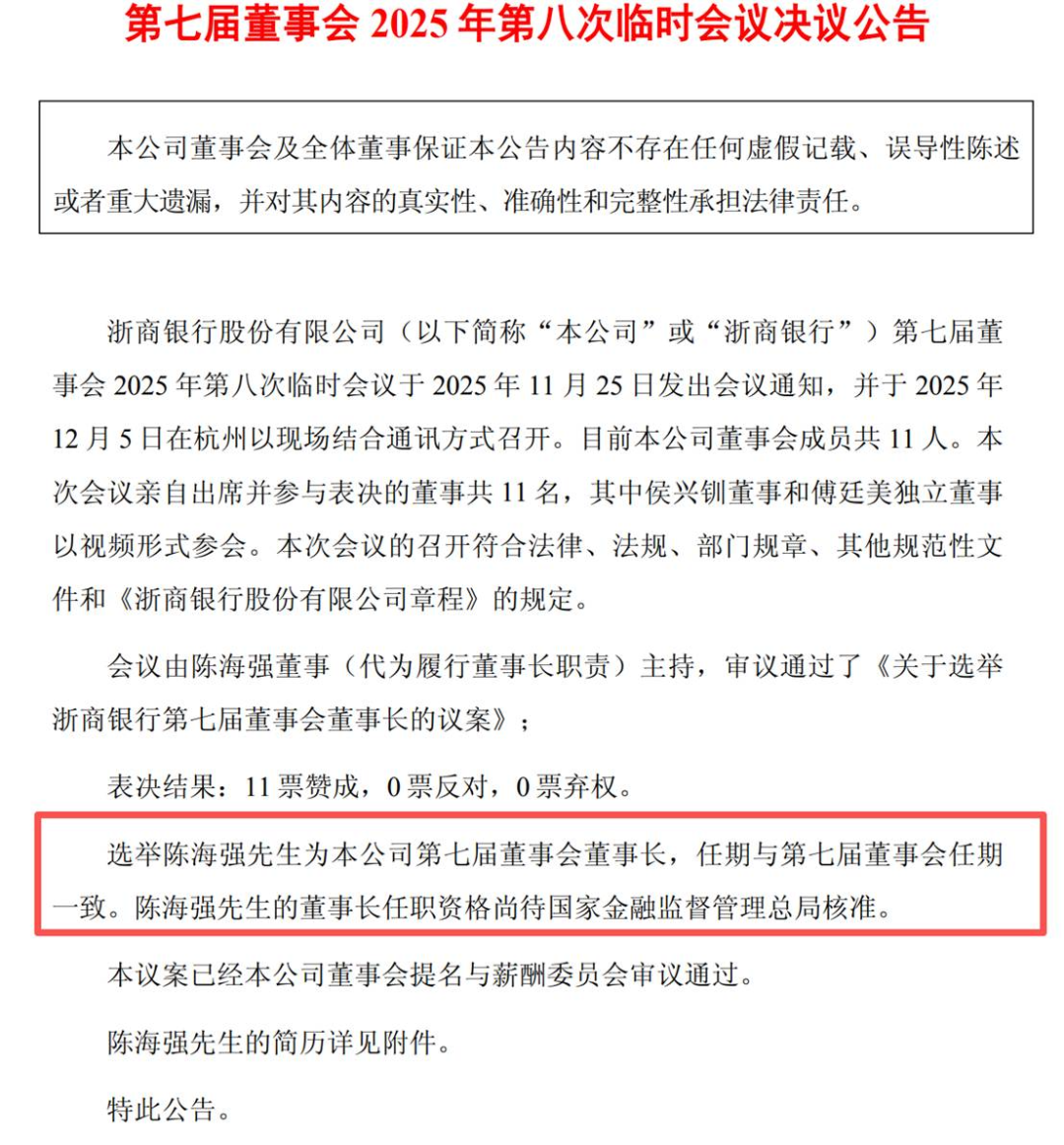 近日, 浙商银行 发布的公告显示,已选举陈海强为 浙商银行 第七届董事会董事长,任期与第七届董事会任期一致,但职资格尚待 国家金融监督管理总局 核准。