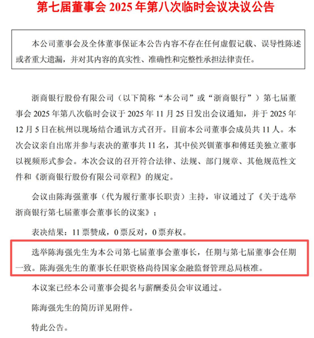 2025年12月5日,浙商银行第七届董事会第八次临时会议审议通过议案,选举陈海强为董事长,任职资格待国家金融监督管理总局核准;12月31日,该行发布补充公告,陈海强因工作安排辞任行长,专注董事长职责,同时董事会聘任吕临华为新任行长,在任职资格核准前代为履行职责。