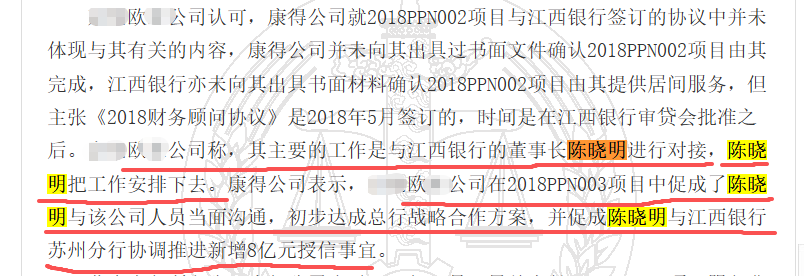 欧某投资方面称,其主要的工作是与江西银行时任董事长陈晓明进行对接,陈晓明把工作安排下去。康得公司表示,欧某投资在2018PPN003项目中促成了陈晓明与该公司人员当面沟通,初步达成总行战略合作方案,并促成陈晓明与江西银行苏州分行协调推进新增8亿元授信事宜。