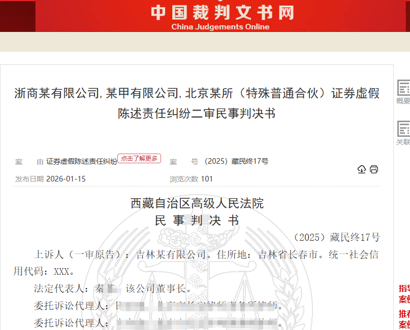 2025年12月30日,吉林银行起诉浙商银行、某券商,某会计事务所,追究证券虚假陈述责任,涉及一笔2亿元的债券交易,在西藏高院开庭。庭审结果,吉林银行的诉求未获得法院支持。