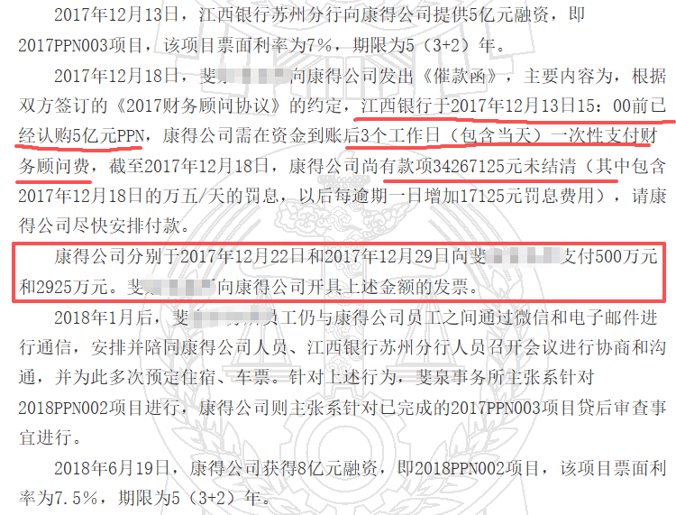 而有两家中介争抢财务顾问费的纠纷,间接揭露了江西银行认购康得PPN的内幕。