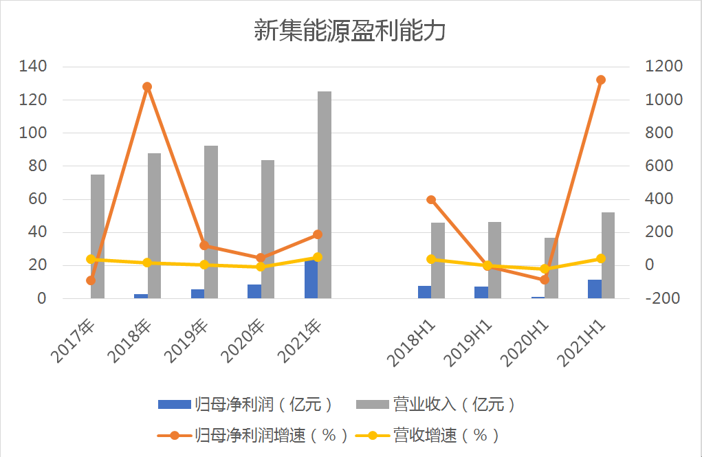 从半年报来看,2018年至2021年上半年,新集能源的归母净利润分别为7.65亿元、7.39亿元、0.94亿元、11.55亿元,2021年上半年公司归母净利润较2020年同期相比有所上升。归母净利润增速分别为397.63%、-3.39%、-87.22%、1123.46%,2021年上半年公司归母净利润增速较2020年同期相比有大幅度上升。归母净利润增速由负转正。营业收入分别为45.62亿元、46.02亿元、36.60亿元、52.13亿元,2021年上半年公司营业收入较2020年同期相比有所上升。营收增速分别为35.54%、0.88%、-20.47%、42.44%,2021年上半年公司营收增速较2020年同期相比有大幅度上升,营收增速由负转正。