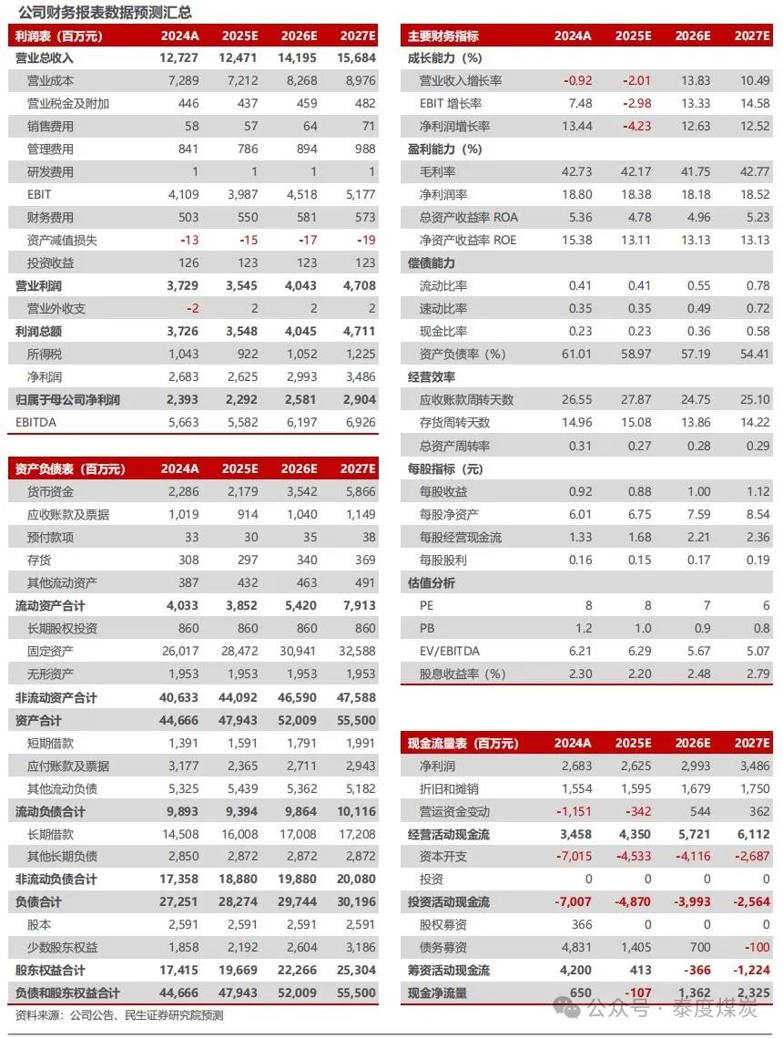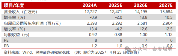 公司电厂项目陆续开工投产,业绩有望高速增长,且公司煤电一体的经营模式有助于盈利能力稳定于高位、推动估值提升。我们预计2025~2027年公司归母净利润分别为22.92/25.81/29.04亿元,对应EPS分别为0.88/1.00/1.12元,对应2025年4月25日收盘价的PE分别为8/7/6倍,维持“推荐”评级。