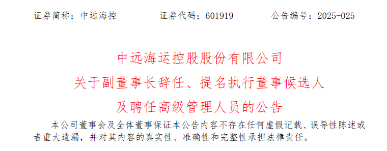 4月16日,中远海运控股股份有限公司(以下简称“中远海控”或“公司”)董事会于收到陈扬帆先生(以下简称“陈先生”)的辞呈,陈先生因工作岗位变动的原因,自愿辞去公司副董事长、执行董事及董事会战略发展委员会主席职务。