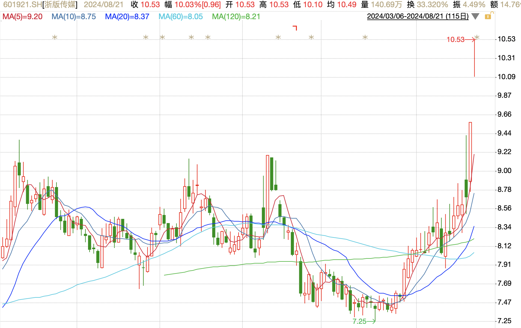 浙版传媒8月21日收盘价格为10.53元/股,较8月16日收盘价8.61元/股涨幅为22.30%。浙版传媒公告内容表示,8月19日至21日,浙版传媒连续3个交易日涨幅偏离值累计超过20%,属于异常波动。根据上海证券交易所相关规定,浙版传媒对相关问题进行了必要核实,包括公司生产经营情况、重大事项情况,媒体报道、市场传闻、热点概念情况,以及其他股价敏感信息。
