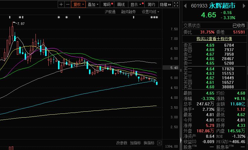 受此影响,3月13日,永辉超市报跌3.33%,报4.65元每股。