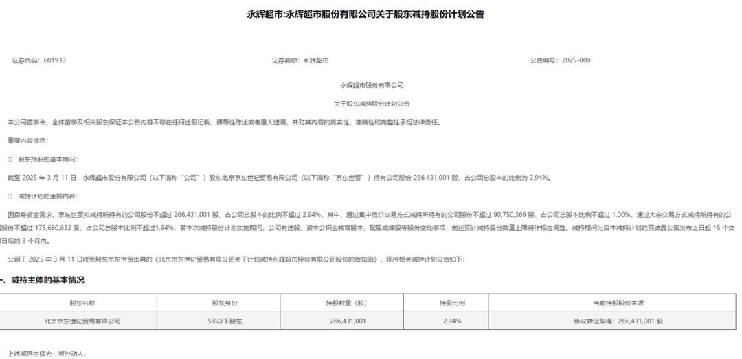 根据永辉超市的公告,京东世贸拟通过集中竞价交易方式减持不超过9075万股、占公司总股本比例不超过1%,通过大宗交易方式减持不超过1.76亿股、占公司总股本比例不超过1.94%。减持期间为自该减持计划的预披露公告发布之日起15个交易日后的3个月内。